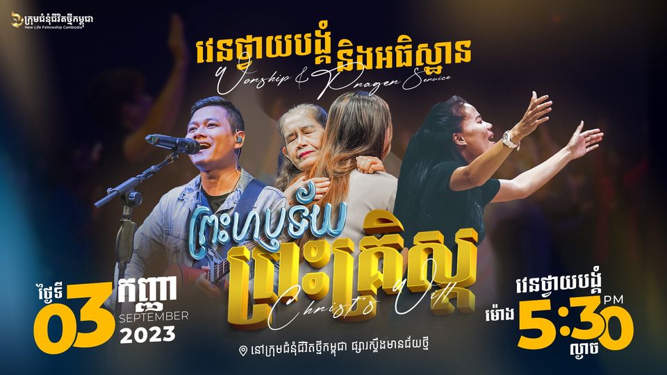 ដកឃ្លាពីកិច្ចការងាររវល់ប្រចាំថ្ងៃរបស់លោកអ្នក ហើយចូលក្នុងព្រះវត្តមានព្រះជាម្ចាស់ ដើម្បីស្ដាប់ឮព្រះសូរសៀងព្រះជាម្ចាស់ សម្រាកក្នុងព្រះវត្តមានរបស់ព្រះអង្គ ទទួលកម្លាំងសាជាថ្មី និងទទួលនូវការស្ដារឡើងវិញក្នុងព្រលឹង និងវិញ្ញាណរបស់លោកអ្នក។ ជួបគ្នាថ្ងៃទី ០៣ ខែកញ្ញា ឆ្នាំ២០២៣ ម៉ោង ៥:៣០ល្ងាច នៅក្រុមជំនុំជីវិតថ្មីកម្ពុជា ផ្សារស្ទឹងមានជ័យថ្មី!